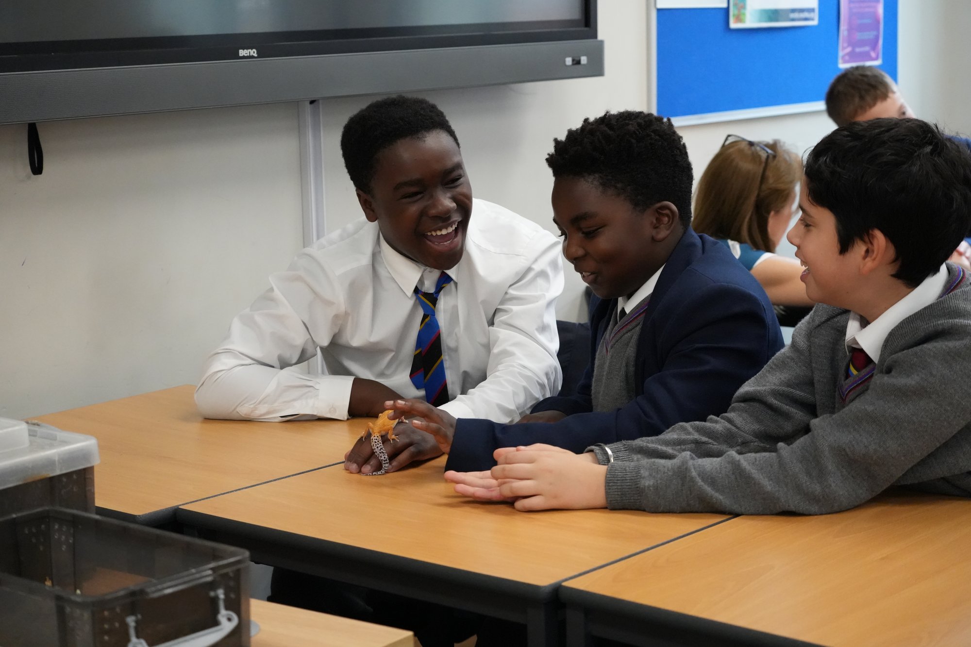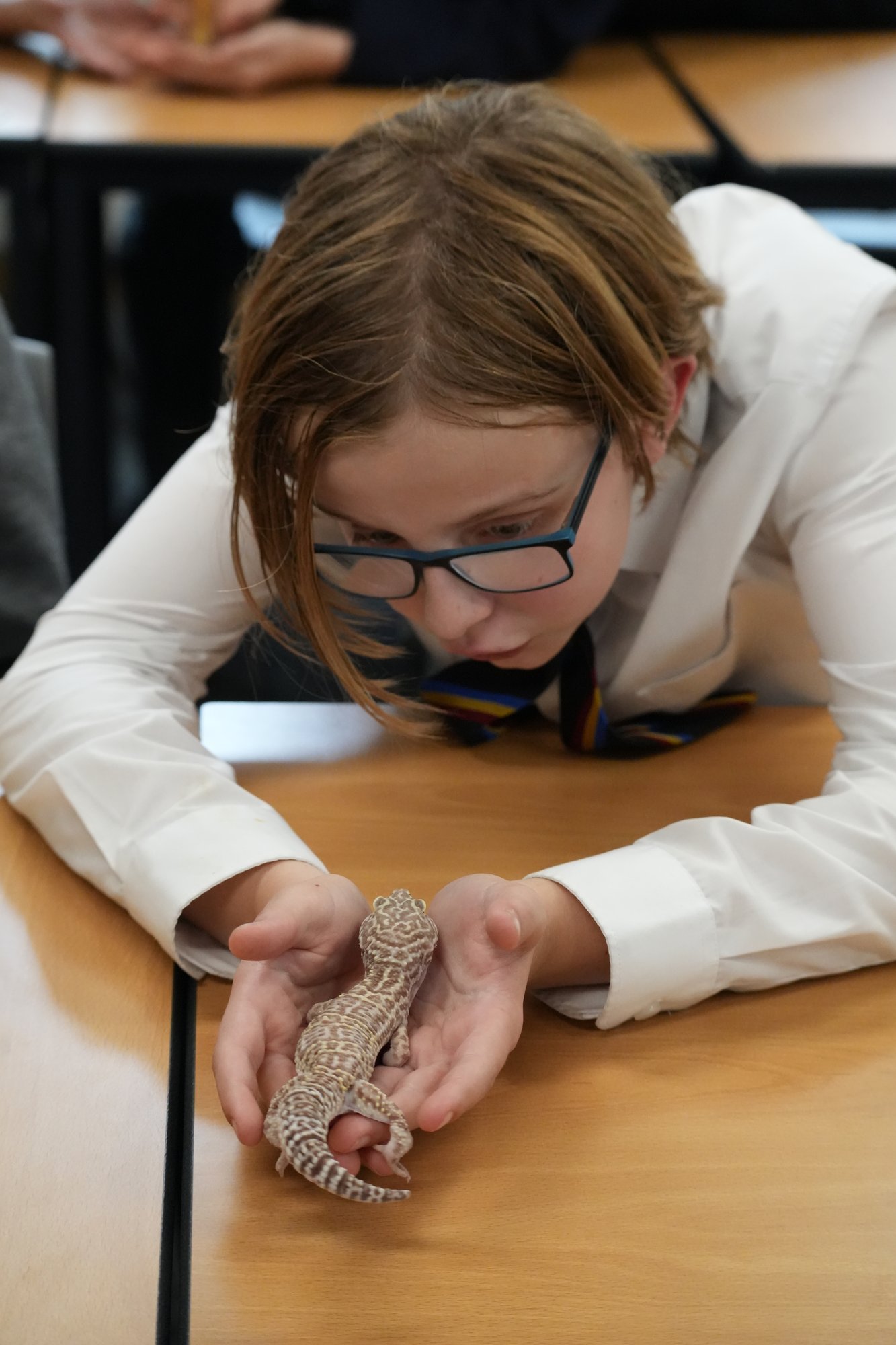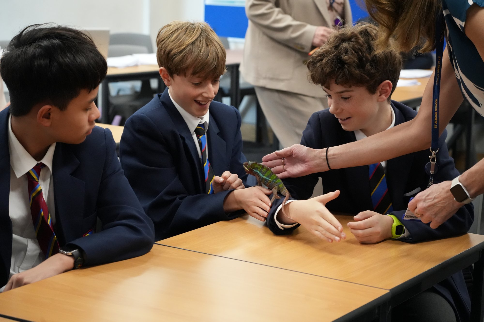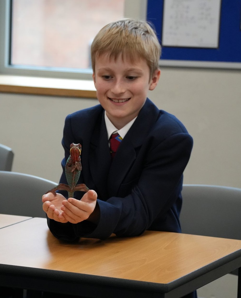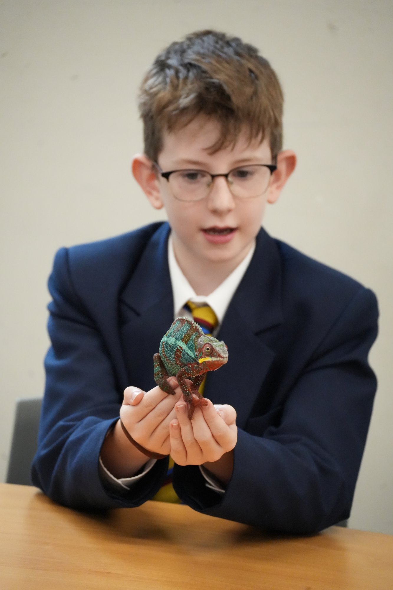 The visiting animals included leopard geckos, a milk snake, a corn snake, and the highlight of the session - a panther chameleon. Pupils were fascinated to watch the chameleon shift its colours from striking blue-green tones to deeper reds and oranges, a natural display of mood rather than camouflage, as is commonly believed.