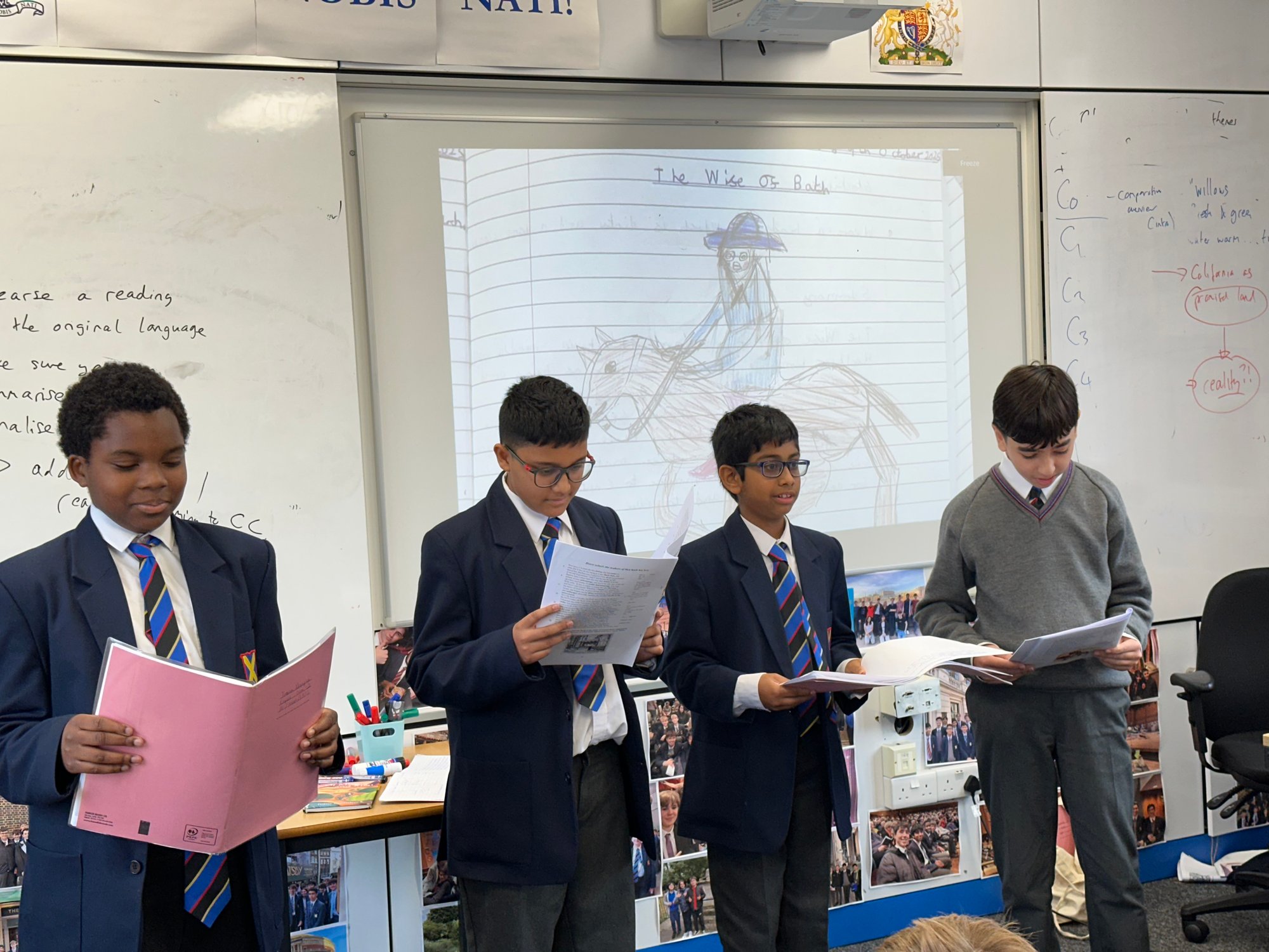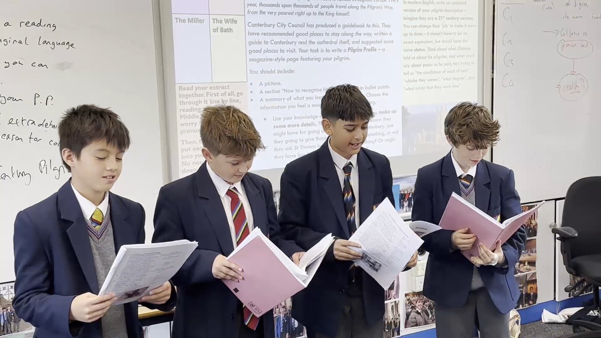 Members of the First Form presented their ‘Pilgrim Profiles’ inspired by Chaucer’s General Prologue to the Canterbury Tales, including dramatic readings in the original Middle English. After performing their extract (such as the portrait of the Miller, complete with sound effects as you can see in the video!) they summarised their findings and used the text to predict what the character’s motive might be for visiting Canterbury.